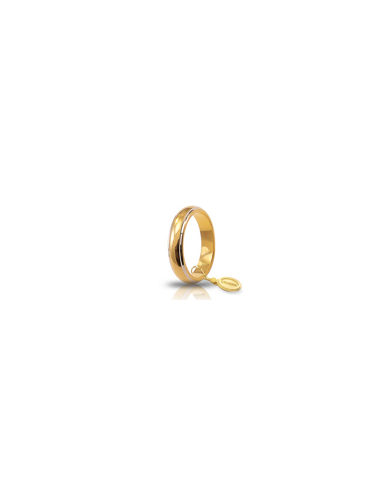 Fede nuziale Classica in oro 750 con bordi bianchi rodiati. Gr 7,00 - Mm 4,50 La raffinata decorazione dei bordi rodiati, rende questo anello unico ed elegante.